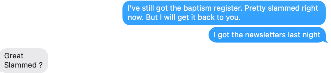 Me: I’ve still got the baptism register. Pretty slammed right now. But I will get it back to you. I got the newsletters last night.”